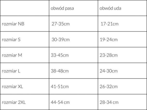 Załóż dziecku formowankę, a następnie zmierz jego obwody. Do otrzymanych wartości dodaj około 2-3 cm zapasu. W ofercie dostępnych jest sześć rozmiarów, dlatego łatwo dopasować gatki zarówno dla noworodka, jak i większego dziecka.