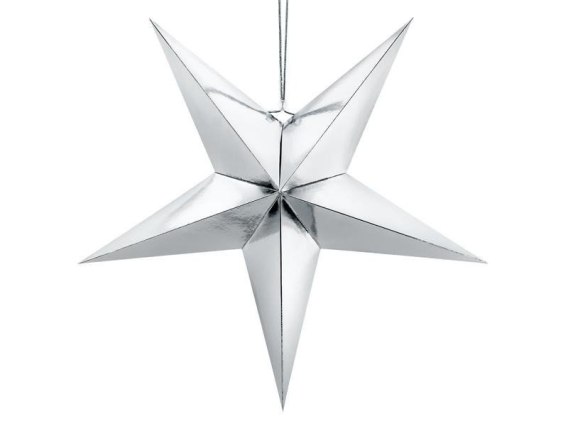 Gwiazda papierowa pięcioramienna wykonana ze srebrnego lustrzanego papieru, ze srebrnym sznurkiem, średnica ok. 70 cm.