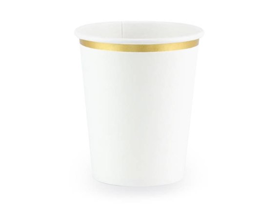 Kubeczki papierowe w kolorze białym ze złotymi brzegami.