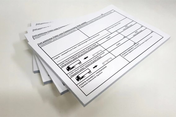✅Jednokolorowy druk na papierze samokopiującym w formacie A5. Kwit paletowy klejony jest w bloczek i dodatkowo usztywniany kartonową tekturką od spodu (podkładka) i na zewnątrz (okładka).