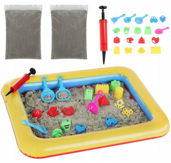 ✅Zestaw piasku dla dzieci zawiera 14 plastikowych foremek, grabki, sito, łopatkę i lejek. Z takimi akcesoriami nie sposób się nudzić. W zestawie z piaskiem kinetycznym jest również dmuchana piaskownica, która pozwoli na utrzymanie porządku w miejscu zabawy.