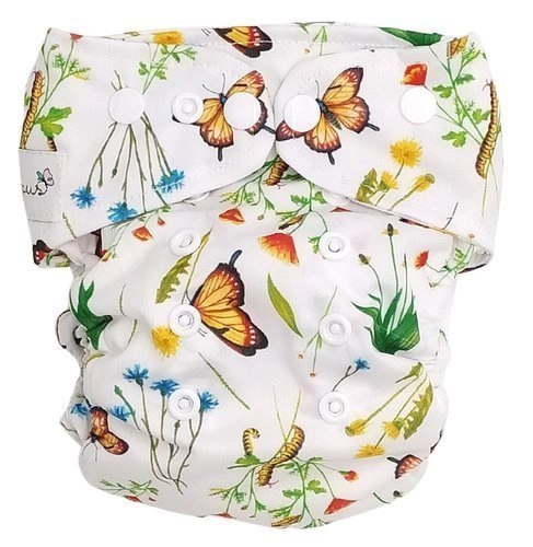 Pieluszka z bawełnianym wnętrzem, jednym rzędem nap i podwójnymi gumkami przy nóżkach.