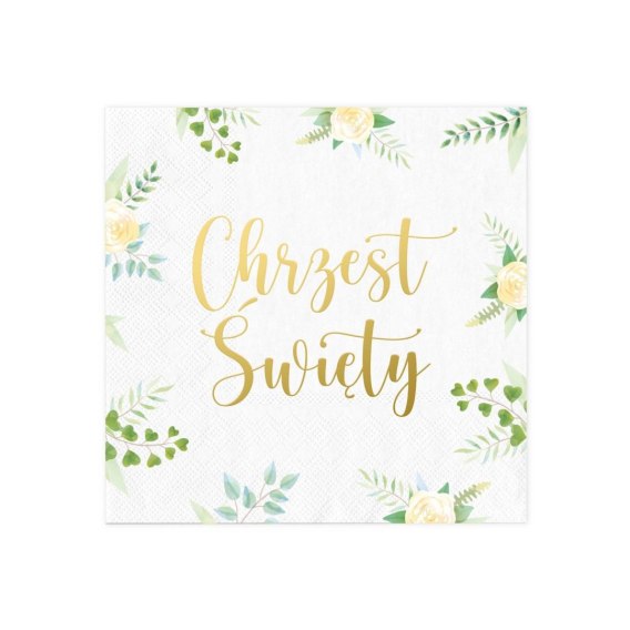 • Serwetki Chrzest Święty białe, zielone kwiaty 33x33cm, 10 szt.