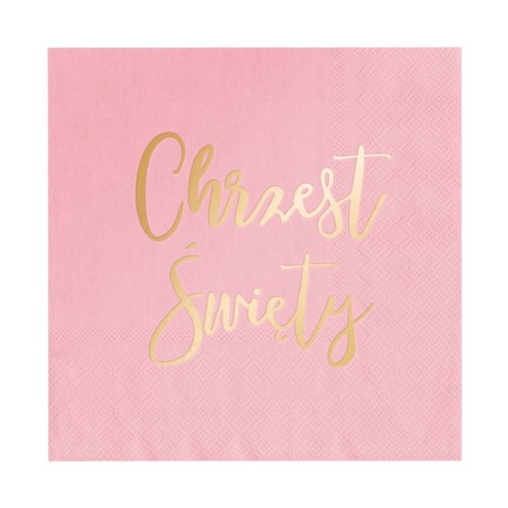 Serwetki papierowe w kolorze różowym ze złotym metalizowanym napisem Chrzest Święty.