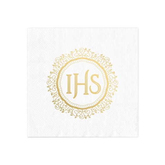 Serwetki papierowe w kolorze białym ze złotym metalizowanym napisem IHS.