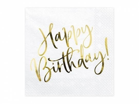 Serwetki papierowe w kolorze białym, z pięknym, złotym metalizowanym napisem Happy Birthday.