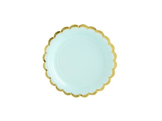 Talerzyki papierowe w kolorze miętowym ze złotymi metalizowanymi brzegami, średnica ok. 18 cm.(1 op. / 6 szt.)