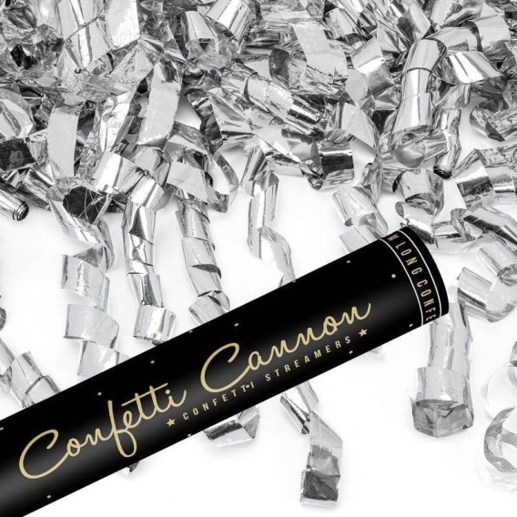 Tuba strzelająca długimi metalicznymi serpentynami w kolorze srebrnym, długość 40 cm.