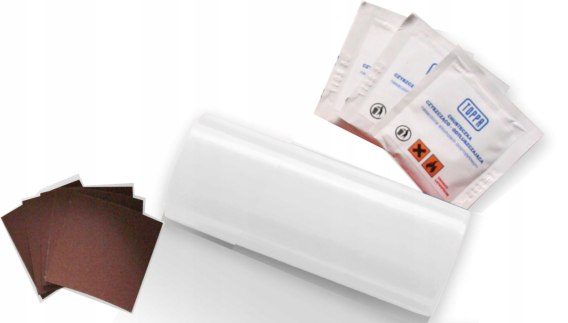 ✅Wyczyść naprawianą powierzchnię i przyklej w to miejsce łatę samoprzylepną.